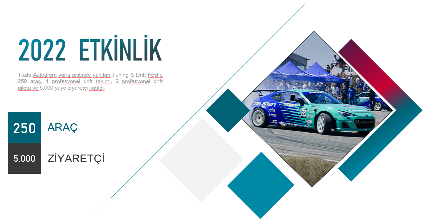 2022 Etkinlik; Tuzla Autodrom yarış pistinde yapılan Tuning & Drift Fest’e 250 araç, 1 profesyonel drift takımı, 2 profesyonel drift pilotu ve 5.000 yaya ziyaretçi katıldı.