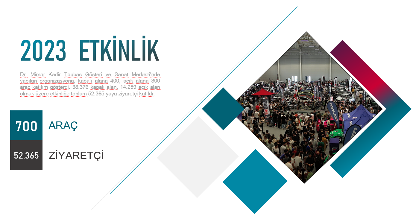 2023 Etkinlik; Dr. Mimar Kadir Topbaş Gösteri ve Sanat Merkezi’nde yapılan organizasyona, kapalı alana 400, açık alana 300 araç katılım gösterdi. 38.376 kapalı alan, 14.259 açık alan olmak üzere etkinliğe toplam 52.365 yaya ziyaretçi ve 700 araç katıldı.